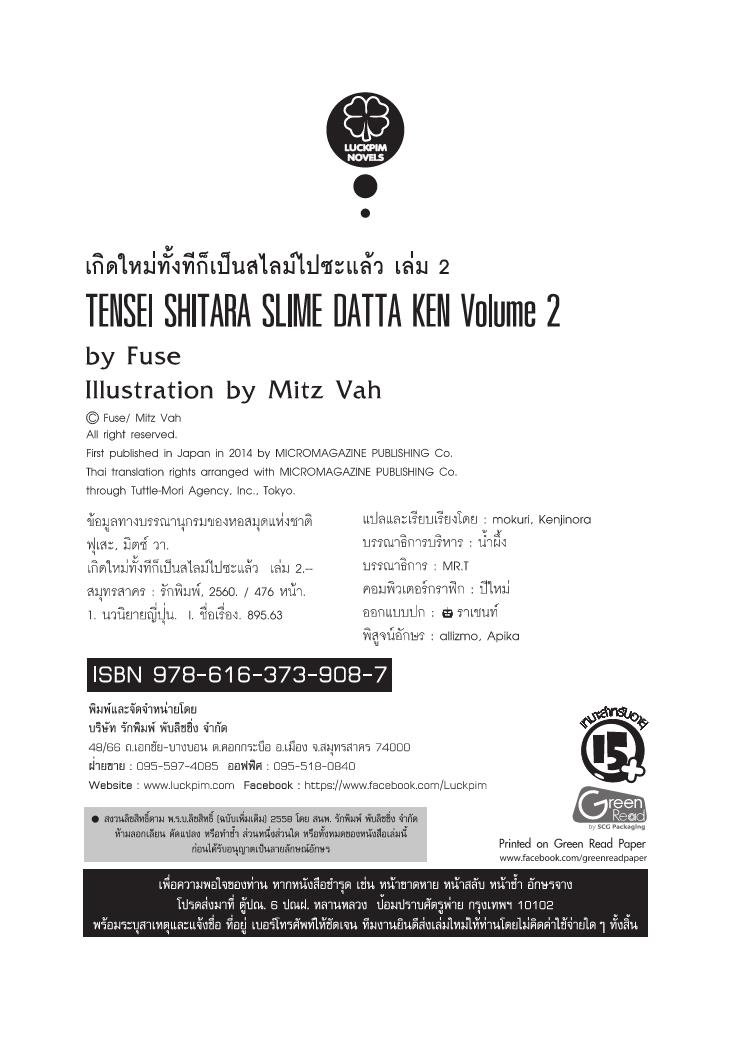 เกิดใหม่ทั้งทีก็เป็นสไลม์ไปซะแล้ว Tensei shitara Slime Datta Ke (ฉบับนิยาย) - เล่ม 2
