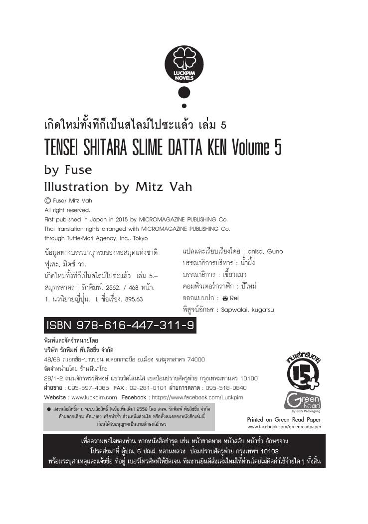 เกิดใหม่ทั้งทีก็เป็นสไลม์ไปซะแล้ว Tensei shitara Slime Datta Ke (ฉบับนิยาย) - เล่ม 5